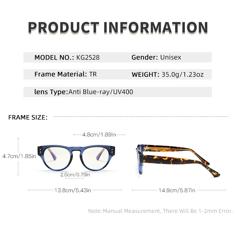 With a frame width of 138mm, lens height of 47mm, and lens width of 48mm, these eyeglasses are designed to fit comfortably while providing an excellent field of vision. The stylish round design adds a sophisticated touch, making them suitable for various occasions, from professional settings to casual outings.