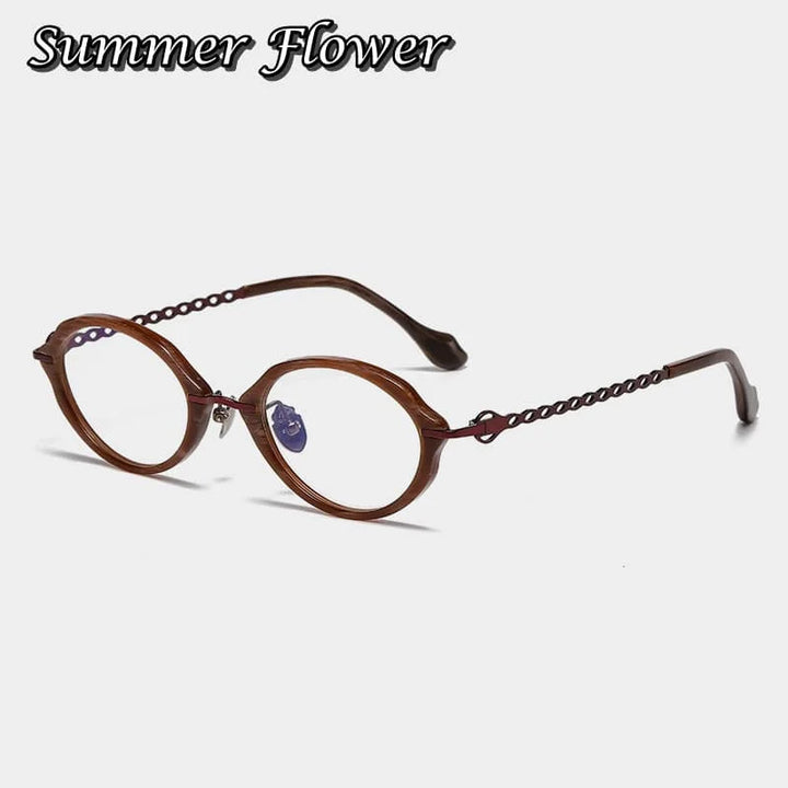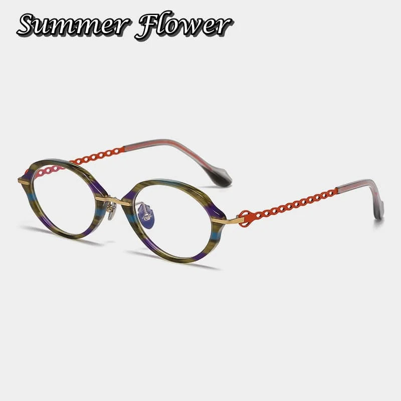 Introducing the Summer Flower Unisex Full Rim Oval Acetate Titanium Eyeglasses (Model Number: 66073), where fashion meets functionality. These stylish eyeglasses are designed to enhance your vision while providing exceptional comfort and durability. Made from a combination of high-quality acetate and titanium, these frames are not only lightweight but also highly resilient, making them perfect for everyday wear.
