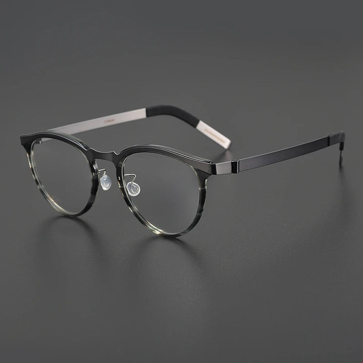 Introducing the Black Mask Unisex Full Rim Round Screwless Titanium Acetate Eyeglasses 9903. Designed with precision and style, these eyeglasses are perfect for those who appreciate quality craftsmanship and modern aesthetics.