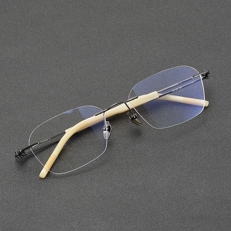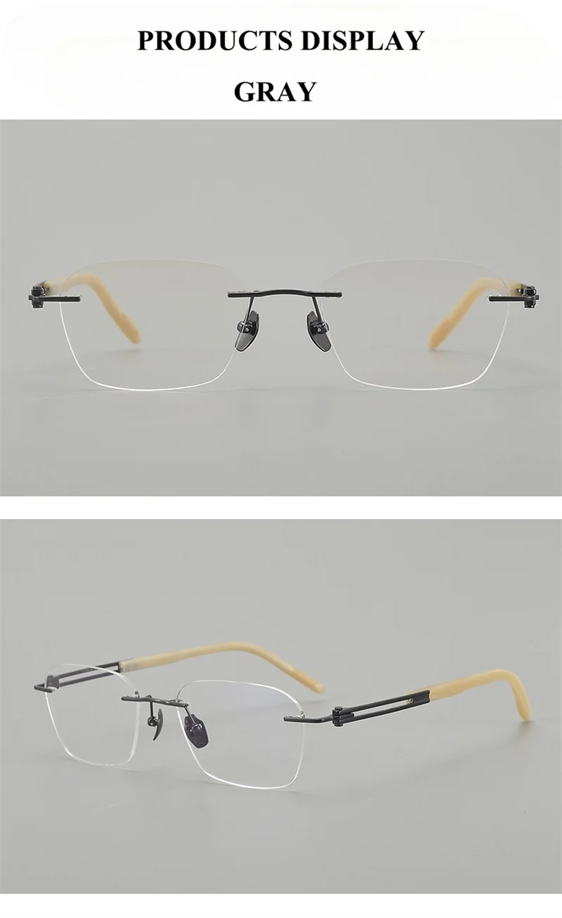 Made with high-quality titanium and luxurious ox horn temple tips, these eyeglasses not only provide a lightweight experience but also exude sophistication. The rimless design adds a contemporary edge while ensuring unobstructed vision and comfort.
