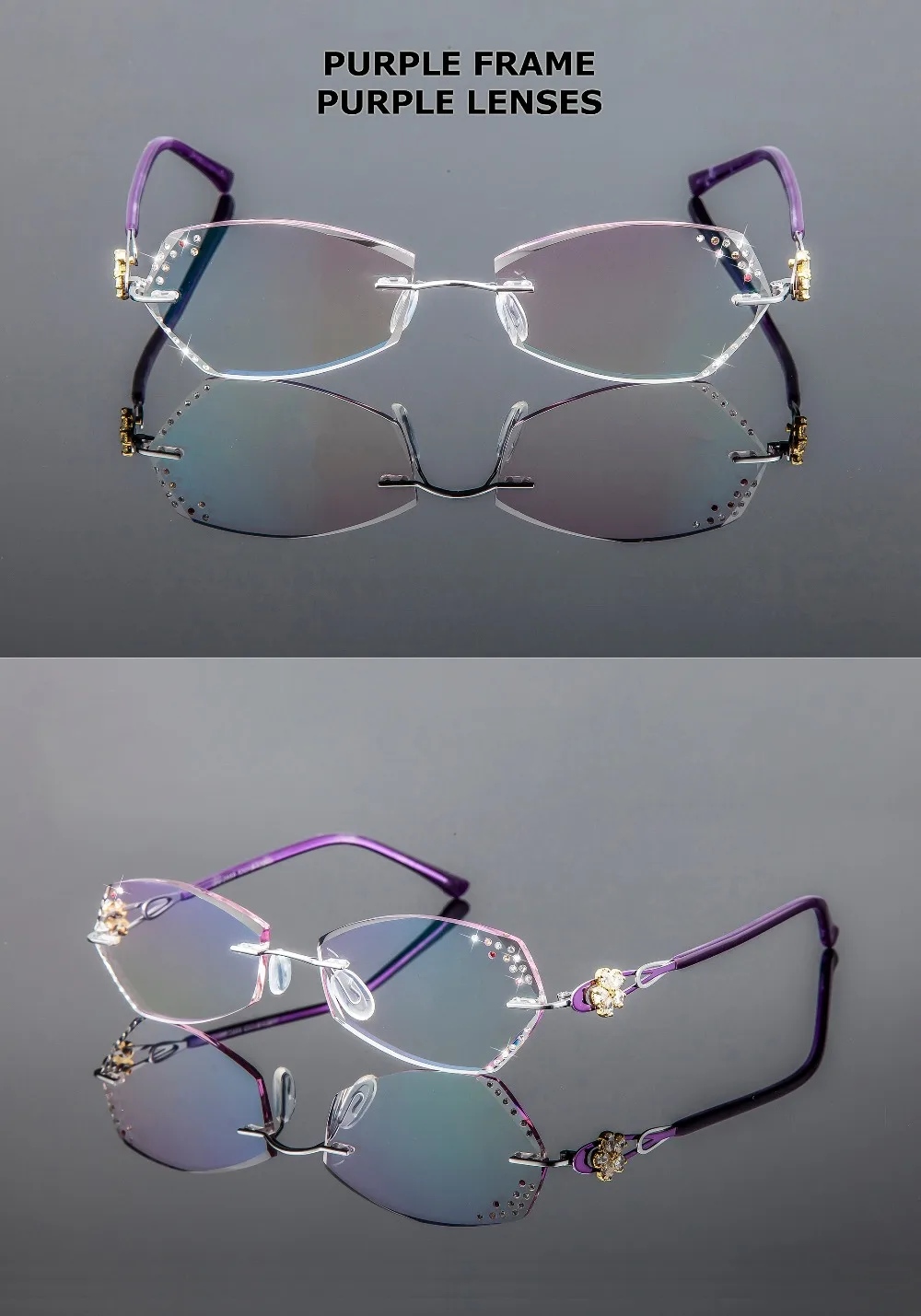 The diamond cutting detail on the rims adds a touch of elegance and uniqueness to these glasses, making them stand out from the crowd. Available in two stunning colors - Blue Frame with Blue Lenses and Purple Frame with Purple Lenses - these eyeglasses are perfect for fashion-forward women.