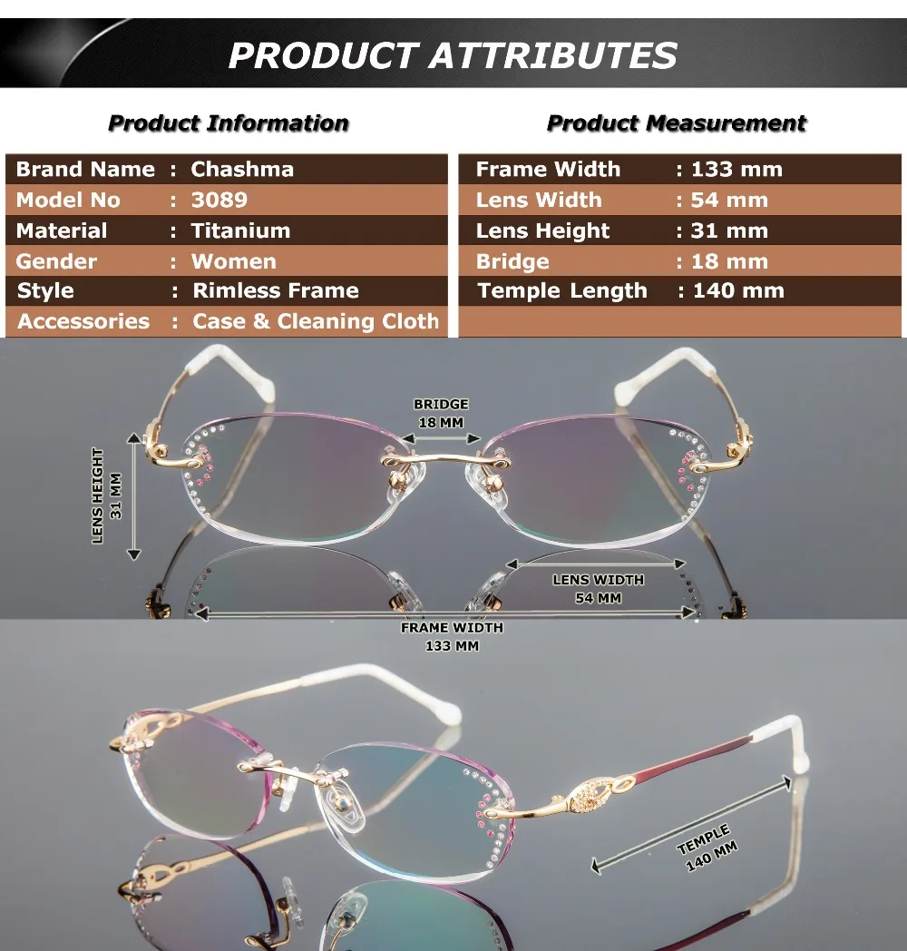 Invest in these Women's Eyeglasses Diamond Rimless Titanium 3089 and elevate your fashion game. Whether you're attending a social event or heading to the office, these eyeglasses will make a lasting impression.