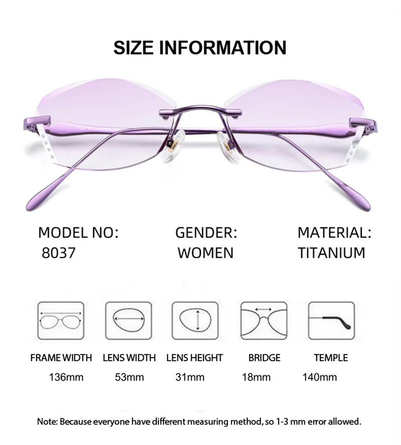 - Rimless Design: Provides an elegant, unobtrusive look that flatters any face shape.