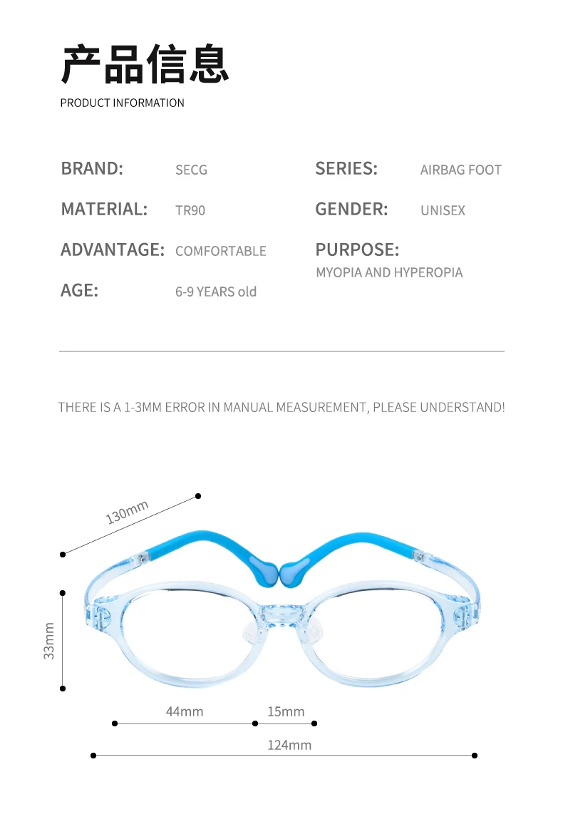 The frame width measures 124mm, providing a secure and comfortable fit for various face shapes. These eyeglasses are perfect for children, featuring a unisex design that accommodates both boys and girls.
