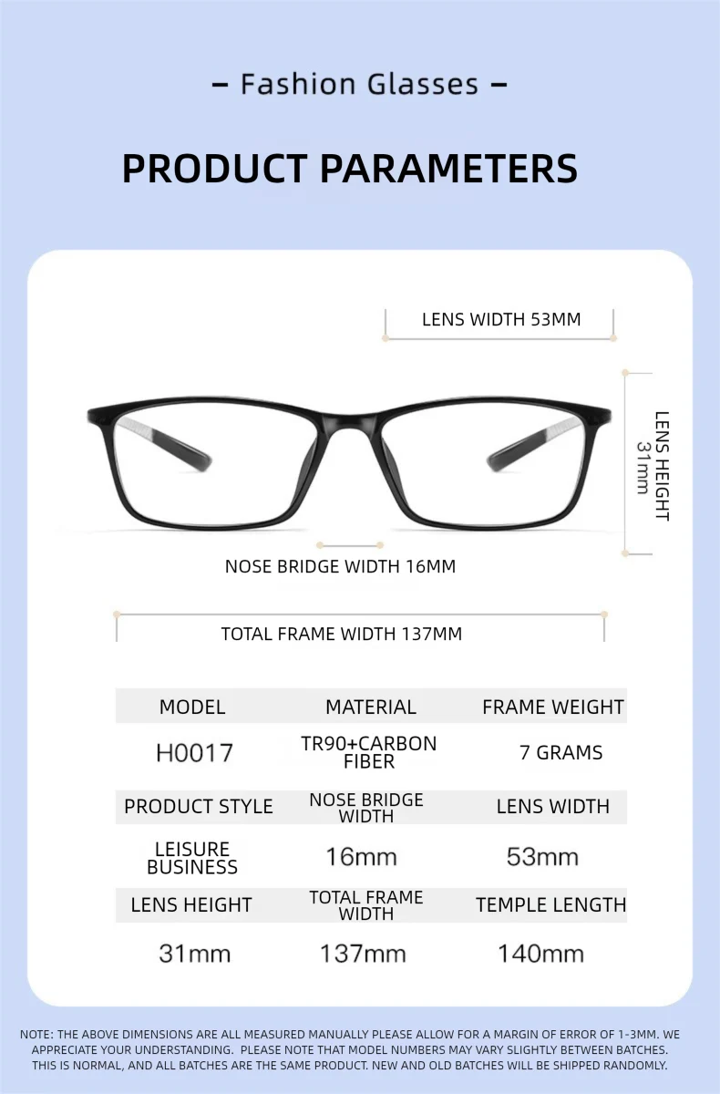 Crafted from durable TR 90 material combined with lightweight carbon fiber, these glasses promise a comfortable fit without compromising on style. The frame dimensions include a width of 137mm, ensuring an ideal fit for most face shapes.