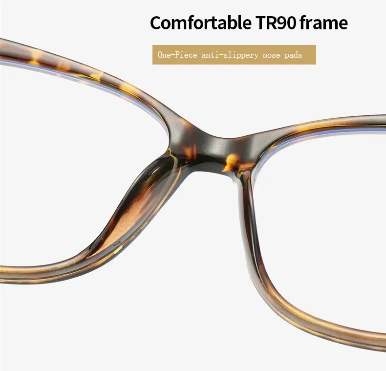The frames of these eyeglasses are made from high-quality TR-90 resin, ensuring durability and longevity. This material is lightweight and comfortable, making it ideal for all-day wear. The full rim cat eye shape adds a trendy and flattering touch to your overall look.
