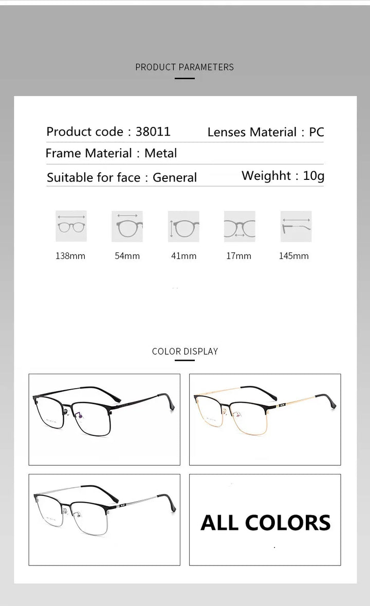 With its stylish square shape and full rim design, these glasses offer a modern and sleek look that suits both men and women. Made from durable alloy material, the frame is built to withstand daily use and maintain its shape for years to come.