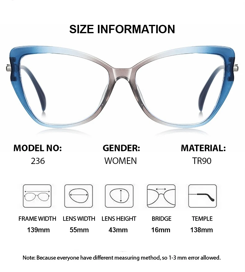 These eyeglasses boast a frame width of 139mm, making them suitable for a variety of face shapes. Crafted from TR 90 and alloy materials, these glasses are lightweight yet sturdy, perfect for extended use. The elegant full rim design not only enhances your facial features but also makes a bold fashion statement.