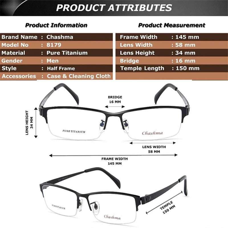 Elevate your eyewear game with Chashma's Unisex Semi Rim Polygon Square Titanium Eyeglasses, model number 778179. These stylish eyeglasses seamlessly blend fashion and practicality, making them a perfect fit for both men and women. The sleek design adds a modern touch to any outfit, ensuring you look your best while enjoying optimal vision.