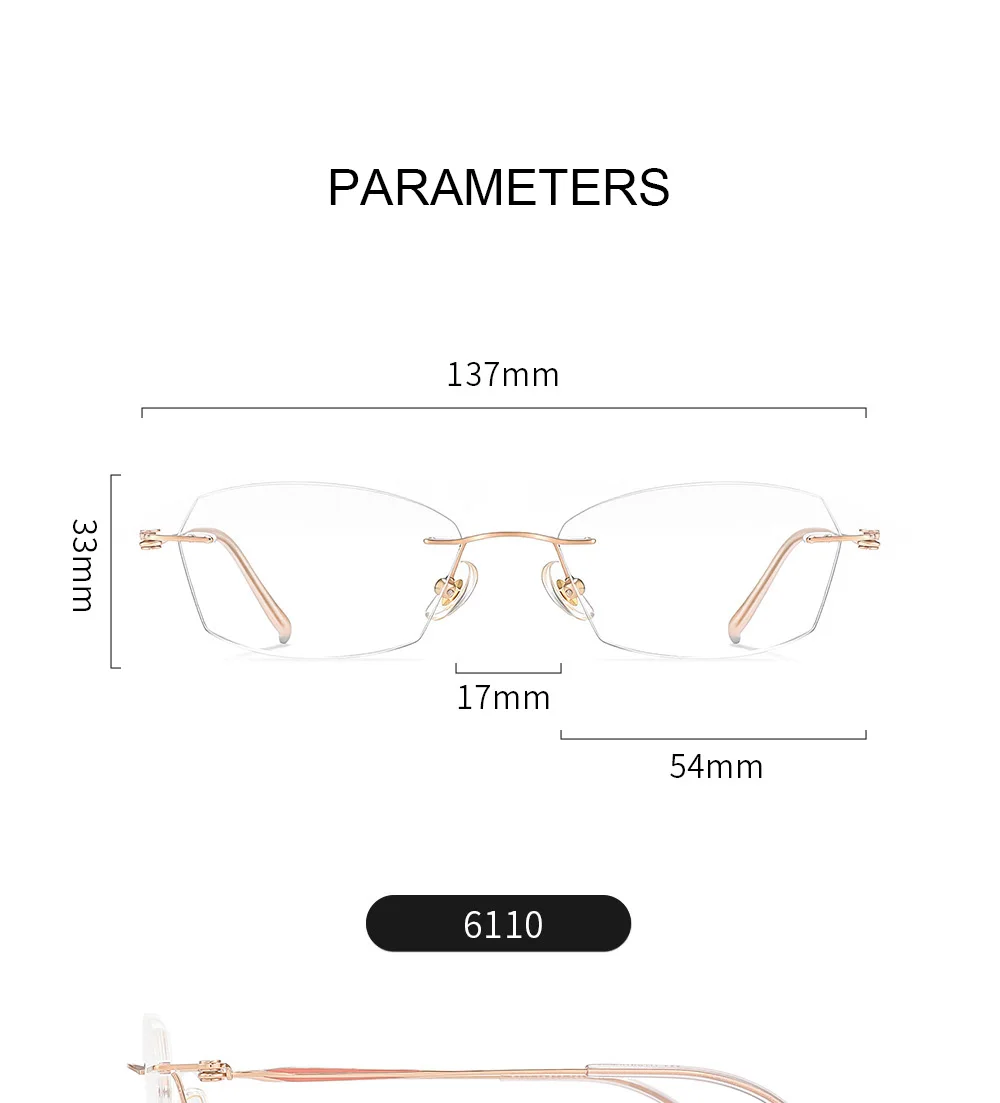 Gmei Optical offers a wide selection of affordable lenses to fit this rimless frame perfectly. For assistance with your prescription or rimless lens shapes, our specialists are ready to help at info@fuzweb.com or +1 (778) 860-5467.