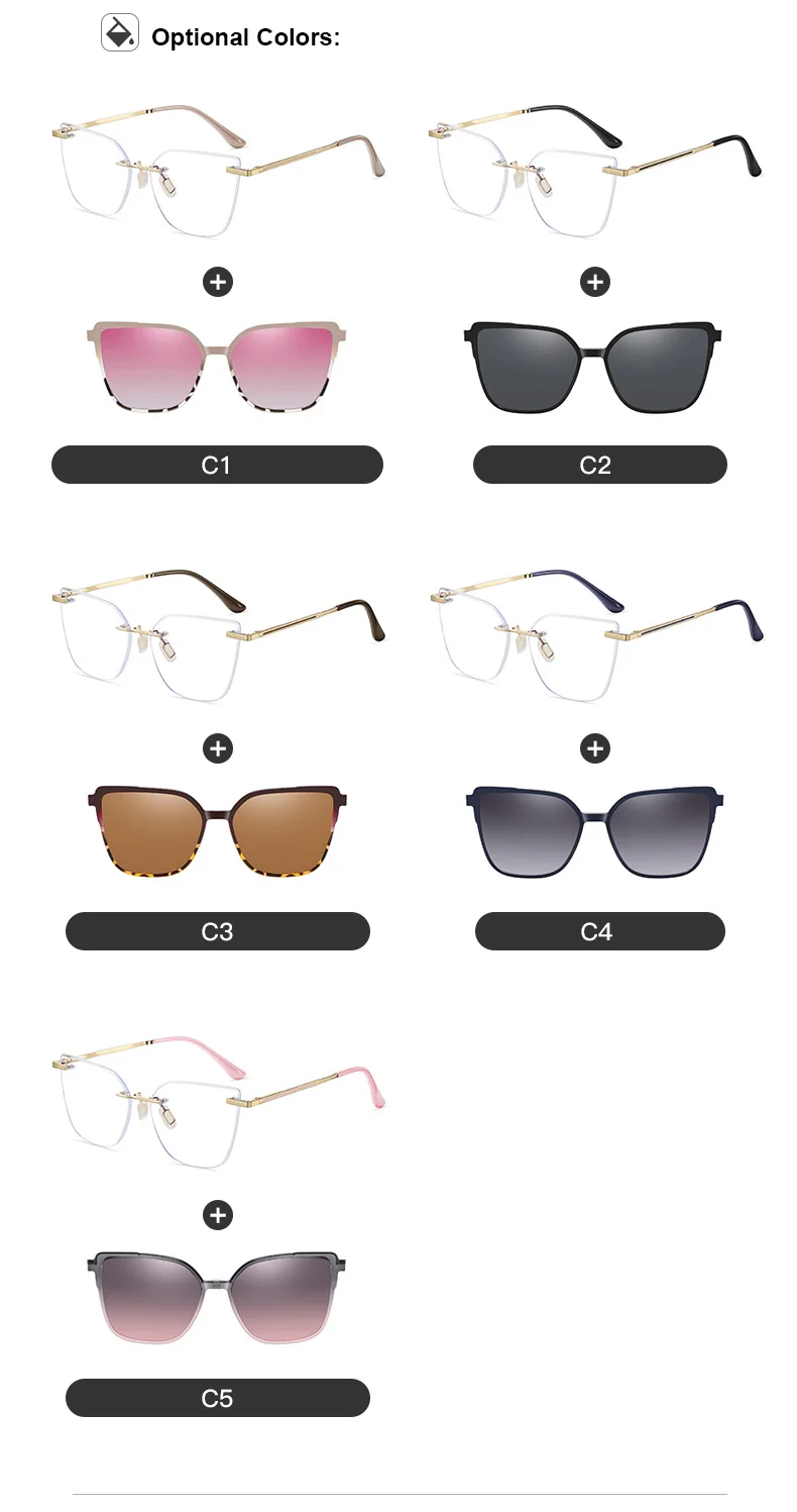 This modular system is an affordable, high-style solution for your vision. The clip on technology allows you to enjoy the clean aesthetic of rimless prescription glasses indoors, while having the ability to snap on a bold, oversized cat eye sunglass look with Polarized TAC optics for high-glare outdoor environments.