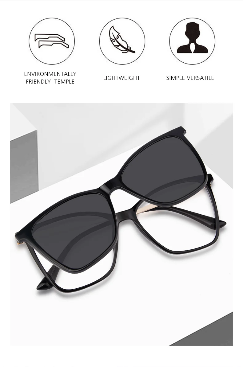 Frame Material: TR 90 + Alloy with magnetized sun clips for easy and secure attachment.