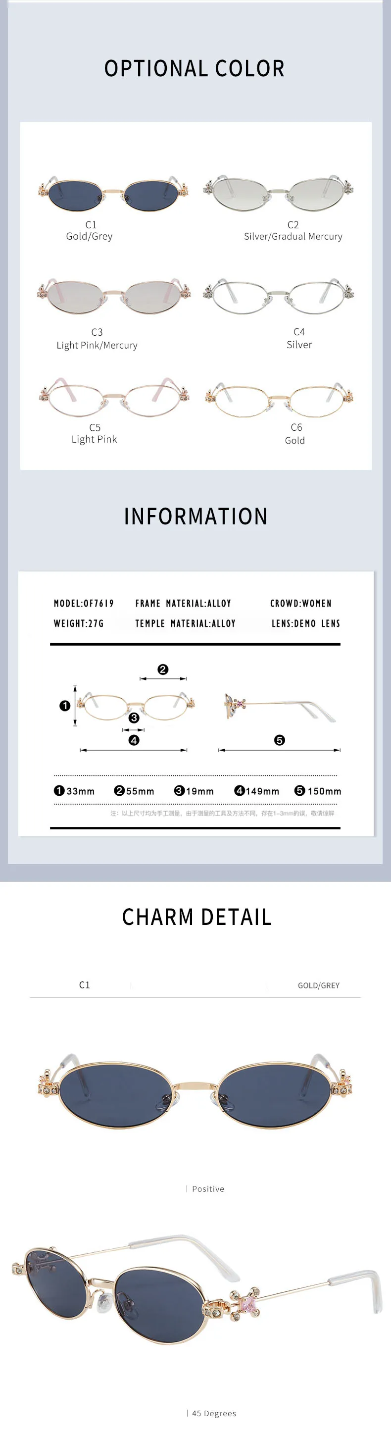With a frame width of 149mm and a lens height of 33mm, these oval glasses are designed to provide a comfortable fit. The lenses have a width of 55mm, making them suitable for myopic (make objects smaller) and hyperopic (make objects bigger) vision correction.