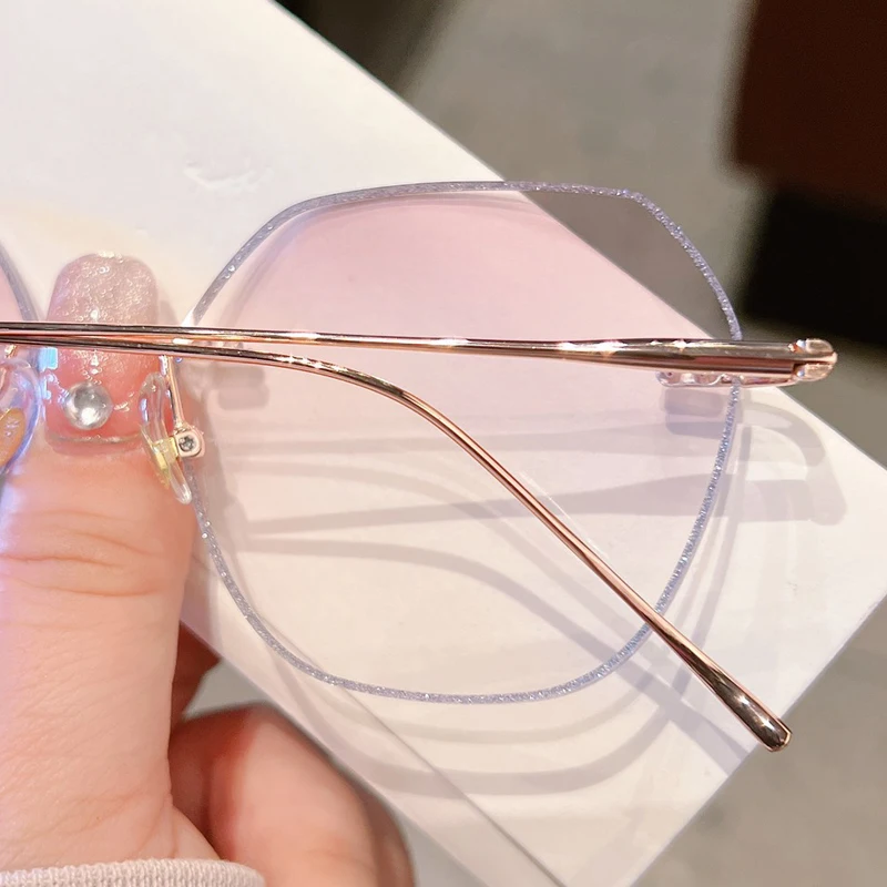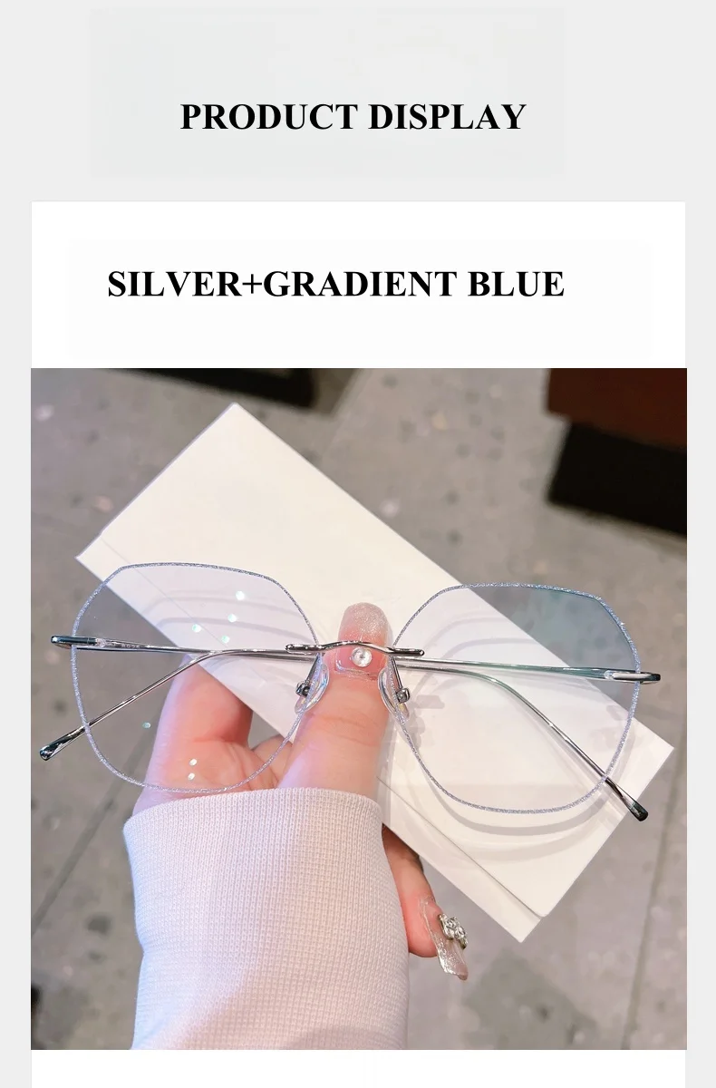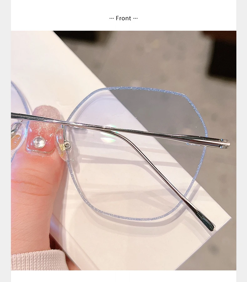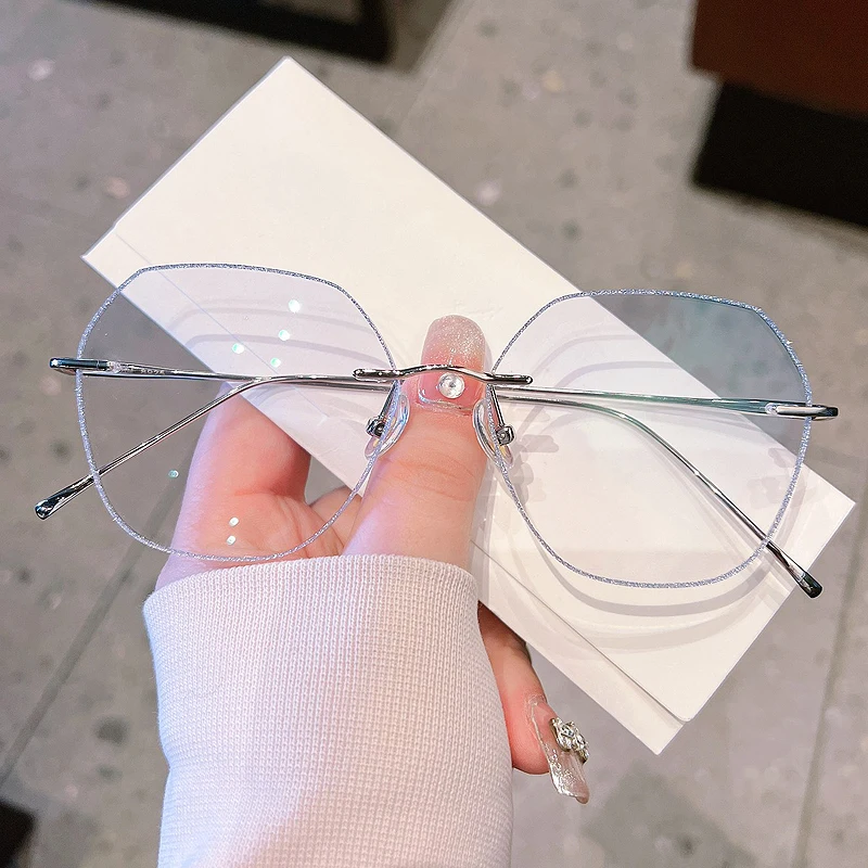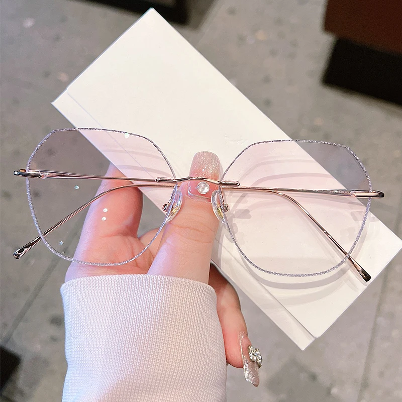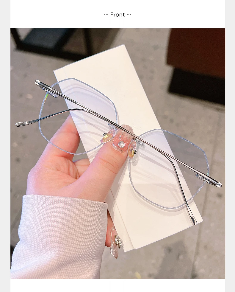 These stylish rimless polygon oval eyeglasses feature a frame width of 140mm, perfectly tailored for women looking for a chic and contemporary look. The glitter detail enhances the overall appeal, making these frames suitable for various occasions, from casual outings to formal events.