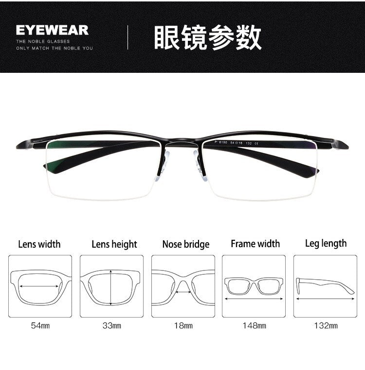 The Men's Browline Half Rim Eyeglasses Alloy Frame 8190 are designed with your comfort in mind. The frame width of 148mm and frame height of 33mm make them suitable for most face shapes. The lens width of 54mm ensures optimal vision clarity for everyday use.