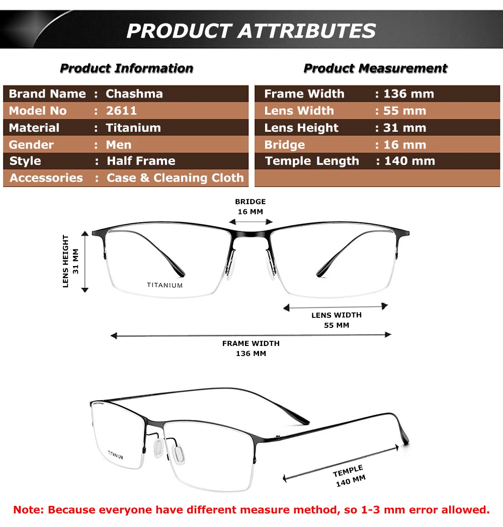 Order now and enjoy the perfect blend of style and functionality with these Men's Eyeglasses Titanium Half Frame Semi Rimmed 2611. Elevate your eyewear collection today!