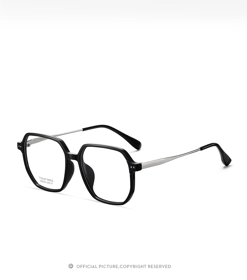 These glasses feature a full rim square frame, measuring 144mm in width, making them an excellent choice for those seeking a contemporary look. The use of TR 90 combined with titanium not only enhances the frame's resilience but also keeps it lightweight, facilitating prolonged wear without discomfort.