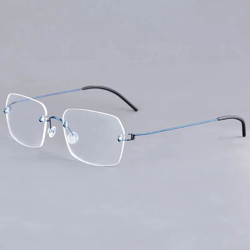 Introducing the Aimee Women's Rimless Polygon Titanium Screwless Eyeglasses - Model Number: 482539. This stylish eyewear combines modern design with exceptional durability, crafted from high-quality titanium and featuring unique screwless hinge temples for a sleek, lightweight feel.