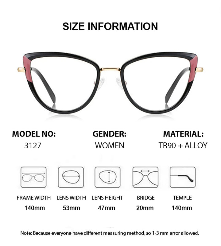 The frame is crafted from high-quality TR 90 material combined with lightweight titanium, ensuring durability and flexibility. With a width of 140mm, these glasses fit comfortably while offering a chic cat-eye shape that enhances any outfit.
